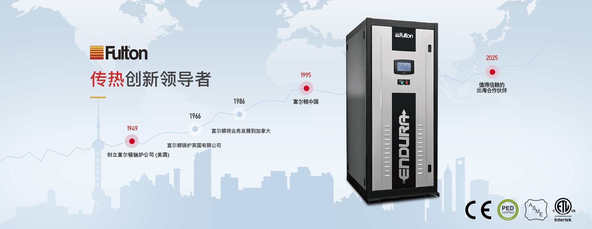 富爾頓是國際著名的跨國高質量傳熱產品制造商,具有七十多年的專業設計、制造、銷售鍋爐的經驗,是立式無管鍋爐和脈沖燃燒鍋爐的發明者,幾十年來一直領導世界鍋爐新潮流。
